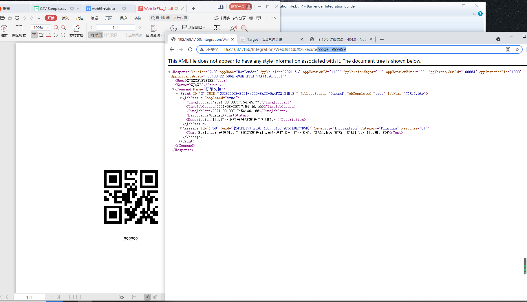 7:复制URL至网页并将改成电脑IP,回车即可打印,可输入变量来打印不同标签,即在网页后面输入?code=999999(?数据源名称=变量值)如下