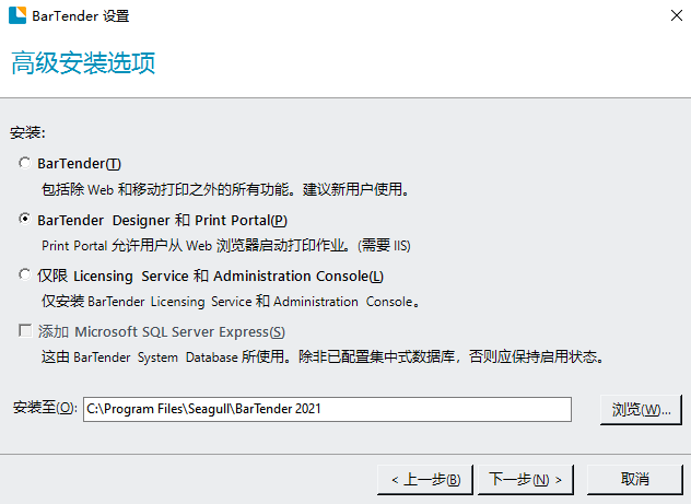 2.安装软件时需勾选我接受许可协议及高级安装选项,点下一步。在高级安装选项里勾选Bartender Designer和Print Portal,点击下一步;