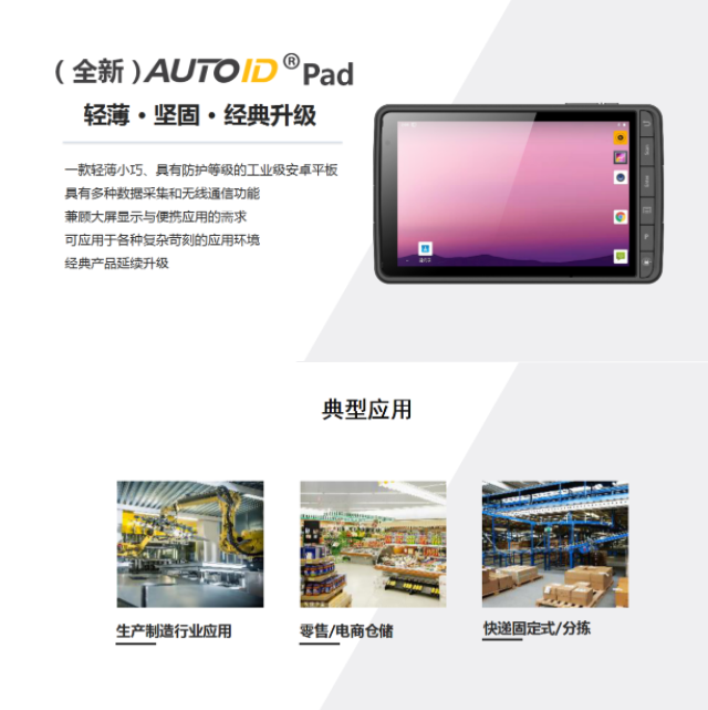 这款助您准点下班的好帮手就是AUTOID Pad Air,它轻薄可靠,拥有专业采集与实时管理能力,所提供的数据化管理方式,可广泛应用于产线、供应链等多个环节。丰富的底部触点设计,为设备赋予了多样化的应用能力,支持不同场景下的移动式、半固定式、固定式使用,让一台设备就能满足您的所有管理需求。