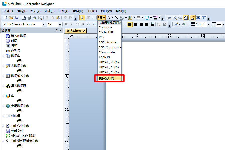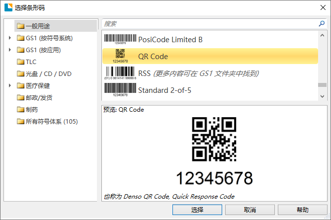在工具栏中找到“条形码”或“二维码”相关的按钮,点击后选择“更多条形码”。在弹出的对话框中,选择所需的二维码类型,如QR Code。