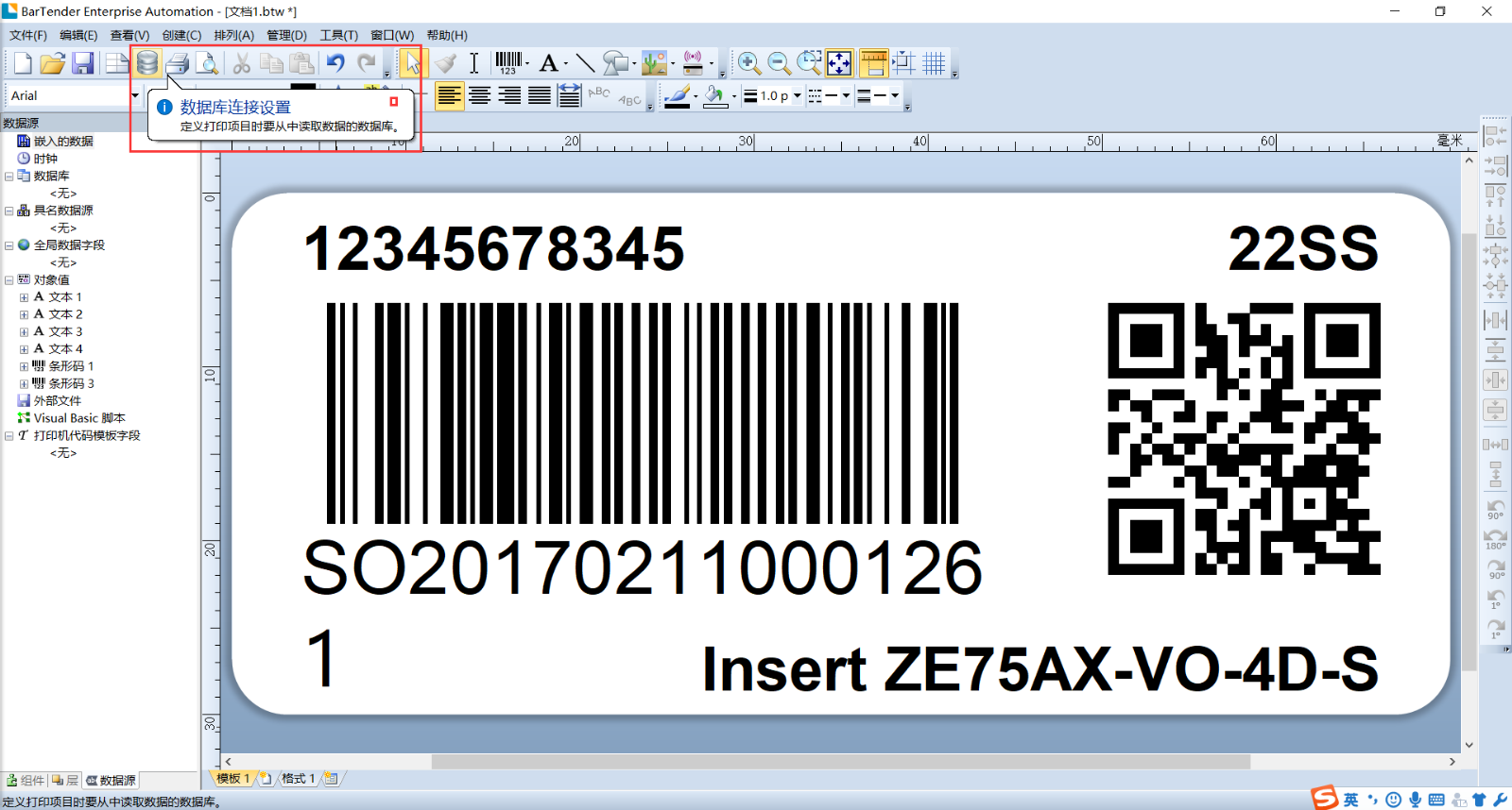 1、第一步当然是链接数据文件了,这个时候我们打开我们之前基础培训教程中完成的标签模板进行演示:点击红框中数据库连接设置