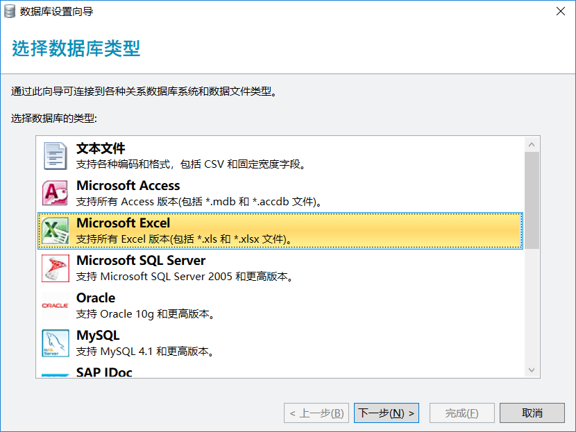 2、选择数据库文件的类型,下图显示了有Bartender可以链接的数据库类型,这里我们先链接excel文件类型,其他的数据库类型我们在以后的培训资料中再做讲解
