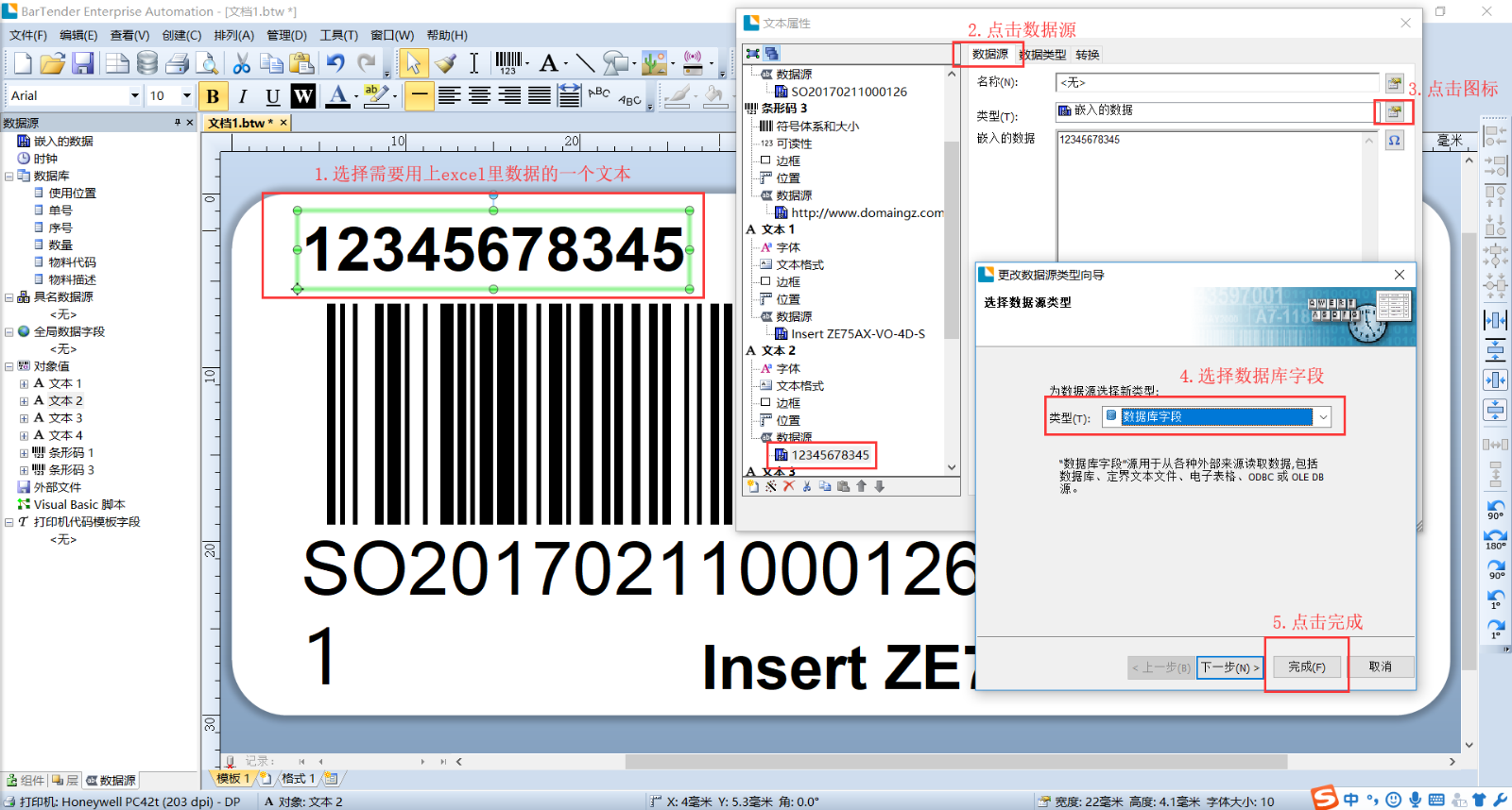 5、如何将标签模板中的文本链接excel文件中相对应的字段,请看下图的操作指示: