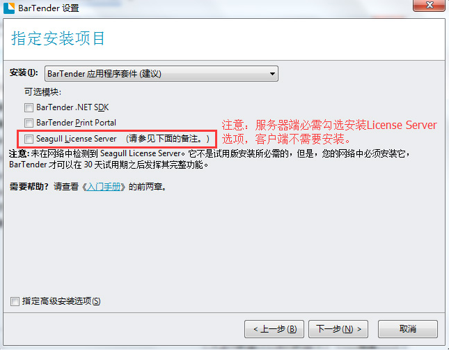 注意:服务器端必需勾选安装Seagull License Server选项,客户端不需要安装。