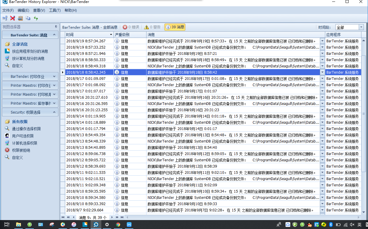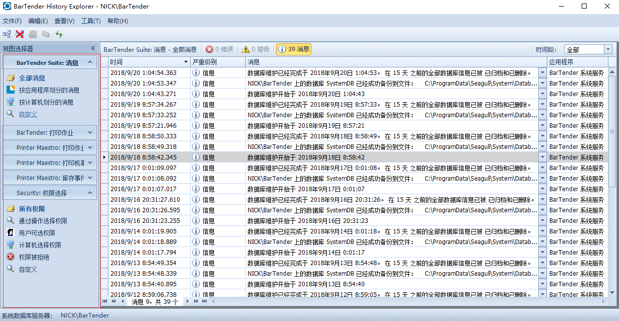 窗格显示BarTender系统数据库中每个记录的详细信息。每个窗格包含过滤的数据,以便显示有关一种类型事件的信息,例如打印作业或安全检查。您可以使用默认位于主用户界面左侧的“视图选择器”窗格选择要显示的事件类型。