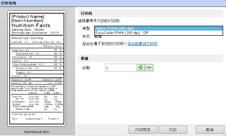 选择自己要的打印标签格式,会显示打印页面出来。该页面提供 Bartender 软件中可用的大多数打印时选项。您可以更改所选打印机、指定打印质量以及进行打印。根据给定标签格式所使用的 Bartender 选项,“打印”页面也可能提供其他控件。