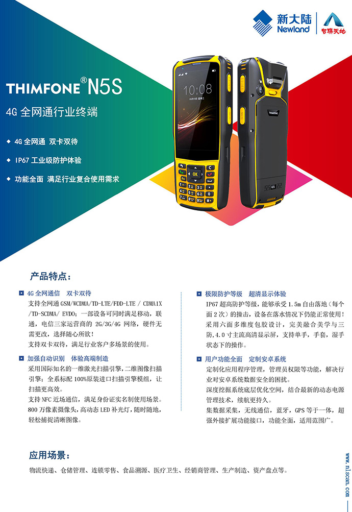 N5S是智联天地最新推出的一款基于4G网络和安卓系统的行业终端;采用六面多维度包胶设计,完美融合美学与三防;4.0寸主流高清显示屏,同时具备了多颗专业的1D/2D扫描引擎。