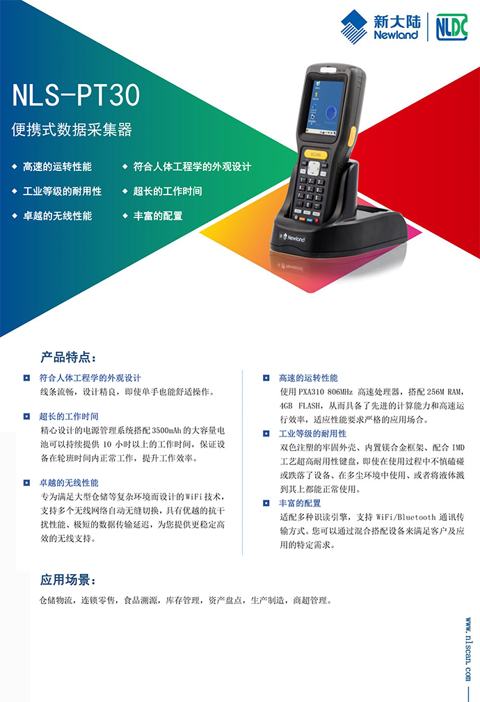 NLS-PT30便携式(条码)数据采集器设计轻巧、功能多样,具备IP54工业防护等级。预装Microsoft windows ces.NET 6.0中文版操作系统,配备Marvell XScale PXA310 806MHz高速CPU、4GB大容量存储空间,支持WiFi/Bluetooth 等通讯 方式,适用于超市、物流、停车、快递、库存管理、医疗卫生等应用场景。