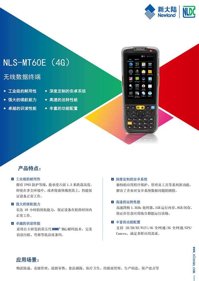 NLS-MT60E(4G) 便携式数据采集器内置安卓操作系统,支持一维、二维条码扫描,可通过4G无线数据通信、蓝牙、Wi-Fi进行数据的传输。广泛应用在医疗、快销、零售、物流、仓储、政府和公共事业等行业,为使用人员提供安全、快速的现代化移动办公机制。