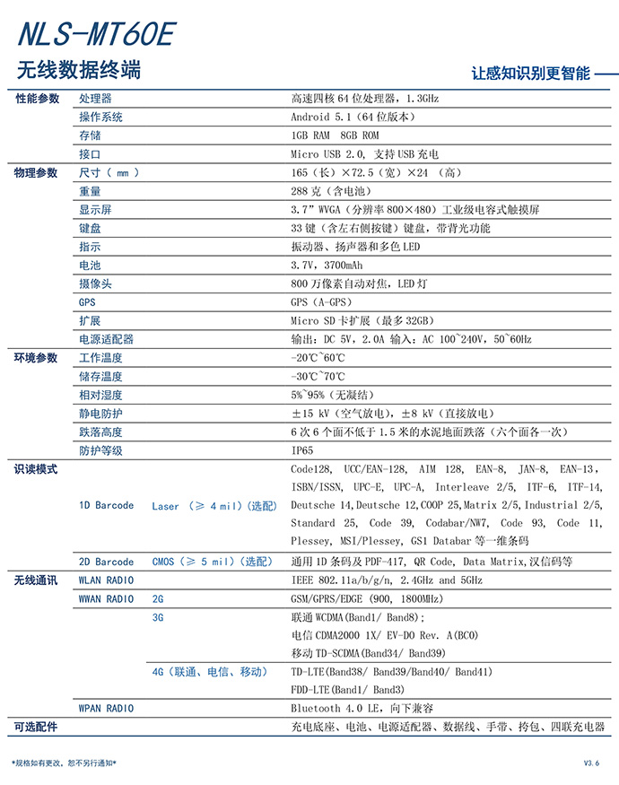 支持 1D/2D/BT/ WiFi/ 4G全网通/3G全网通/GPS/ Camera,满足多样的应用需求。