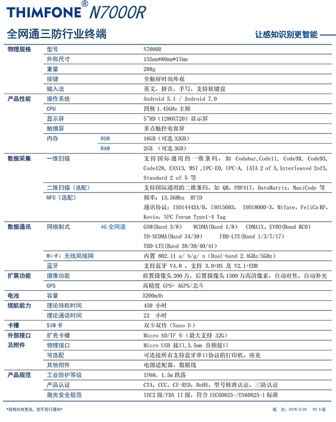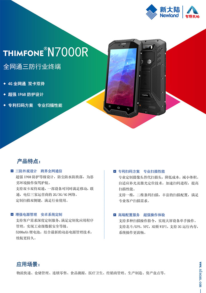 N7000R作为NLS新大陆和智联天地旗下的首款三防形态的跨界行业终端,除了保留了N7000的高端配置,同时强劲的三防结构设计,5200mHA超强续航,新增的左右扫描按键以及座充等行业配置,更加贴近行业的使用需求,同时支持4G全网通信、双卡双待、超强IP68防护设计、专利扫码方案、专业扫描性能。