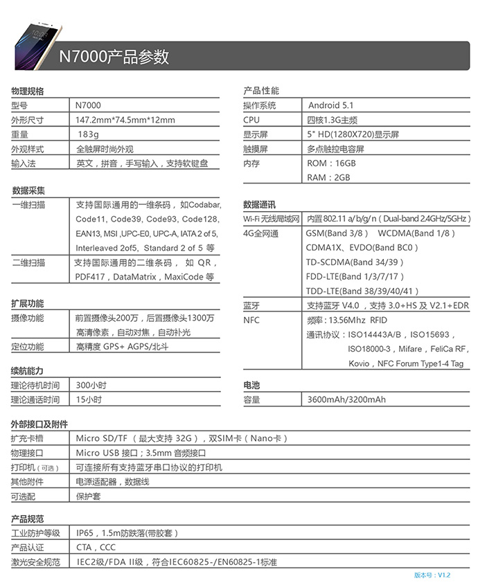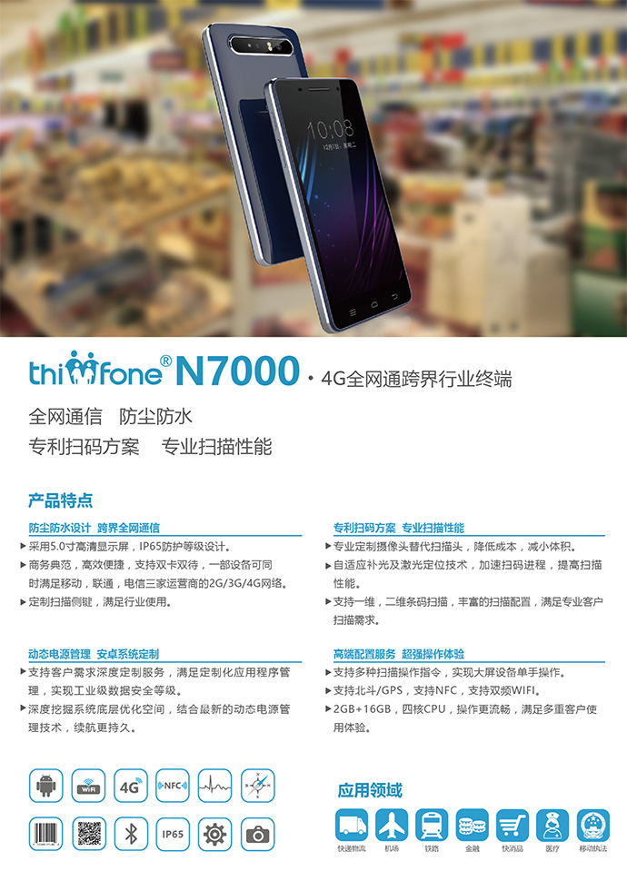 N7000在N5000的基础上,功能和性能实现了全面升级,可以更好的满足客户多方位需求。将传统行业终端和普通手机的优势合二为一,可适应于各类行业市场,同时支持4G全网通,防尘防水、专利扫码方案、专业扫描性能,可以更好的满足客户多方位需求。