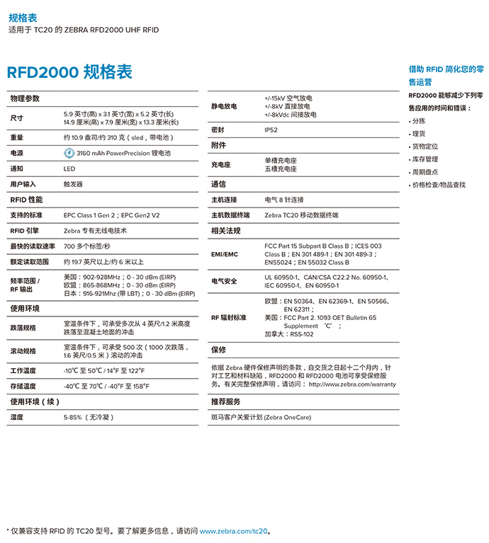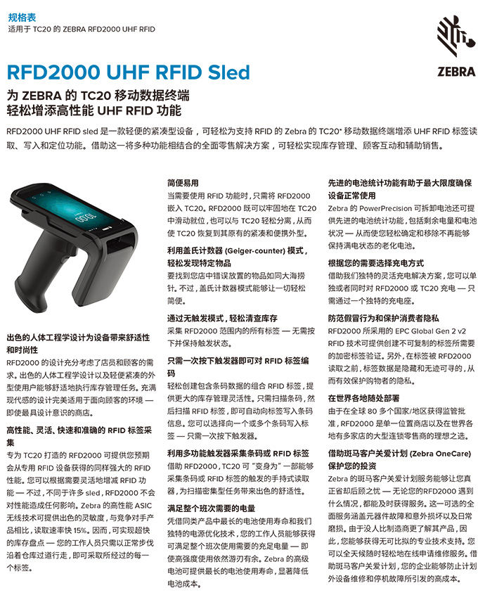 如果您已购入 Zebra TC20 移动数据终端,现在,您只需将 TC20 套入 RFD2000 Sled,即可为其添加强大的 UHF RFID 功能。专为 TC20 设计的 RFD2000 可提供与专用设备完全相同的强大 RFID 性能,您无需牺牲性能,即可获得根据需要添加和去除 RFID 的灵活性。这种绝佳的组合可为您带来全方位的零售解决方案,令库存管理、消费者互动和辅助销售变得轻而易举。