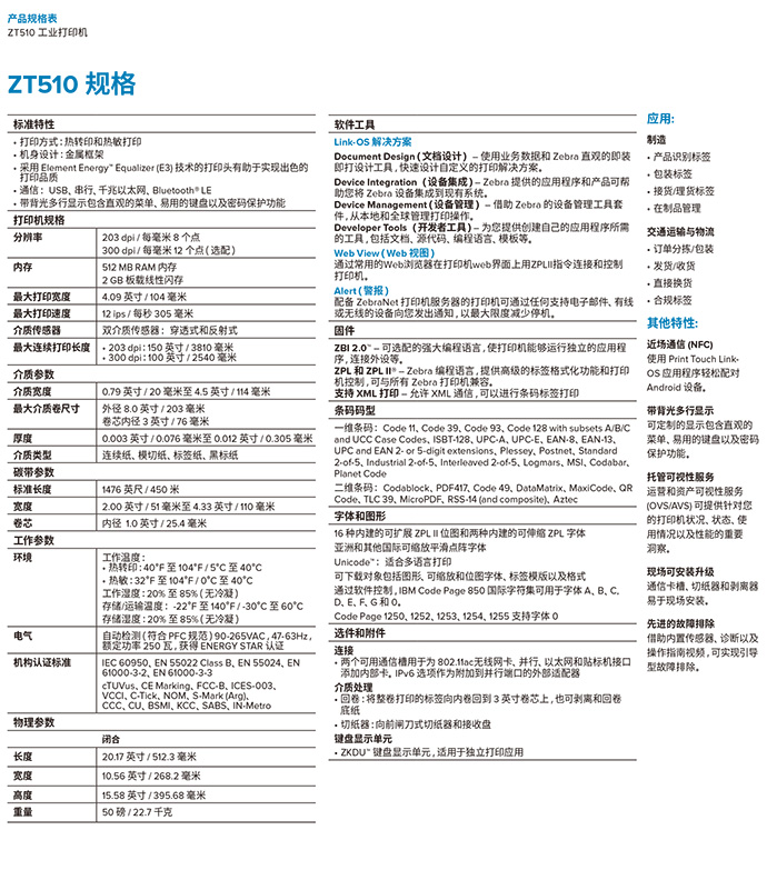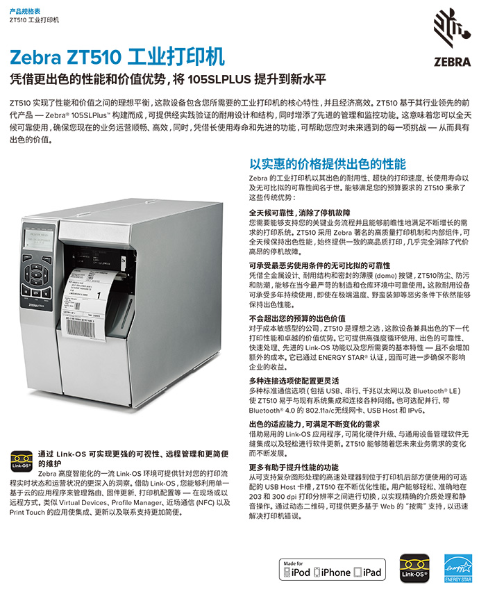 ZT510 可以超值的价格提供新一代打印性能,是注重成本节省的决策者的理想之选。它可提供高占空比、坚固耐用的可靠性、快速处理能力、先进的 Link-OS 功能以及您所需要的所有基本功能,且无需额外成本。