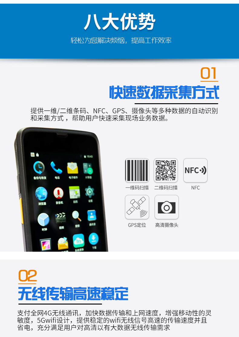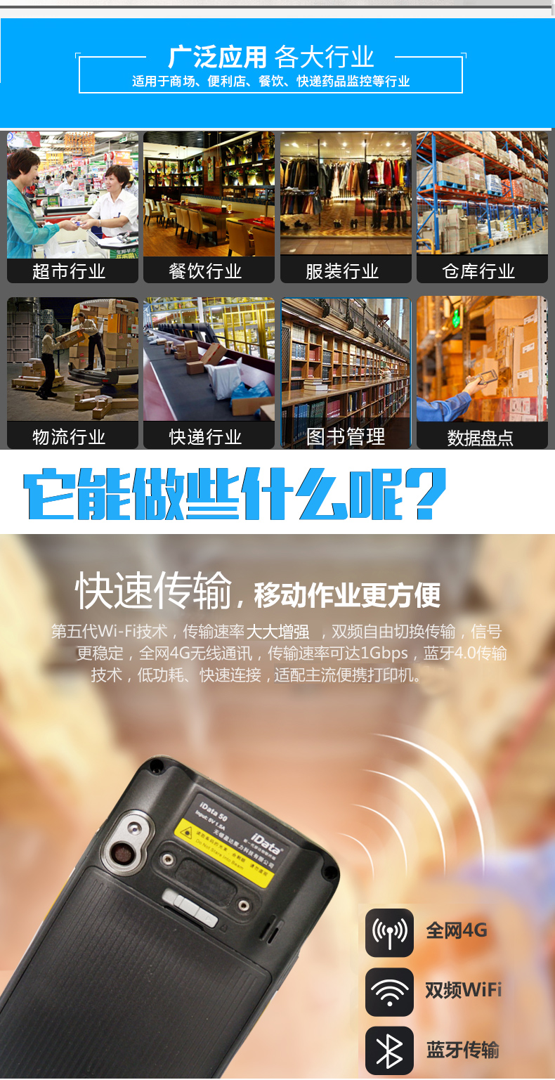 iData 70移动智能RFID终端PDA,采用第五代WIFI技术,传输速率大大增强,采用多种连接方式,多种采集方式,满足您的需求,配备业内强悍的扫描引擎,能够轻松识读条码,机身持握舒适,轻松操作。广泛应用于各大行业,例如:商场、便利店、餐饮、物流等。