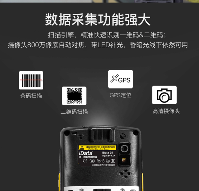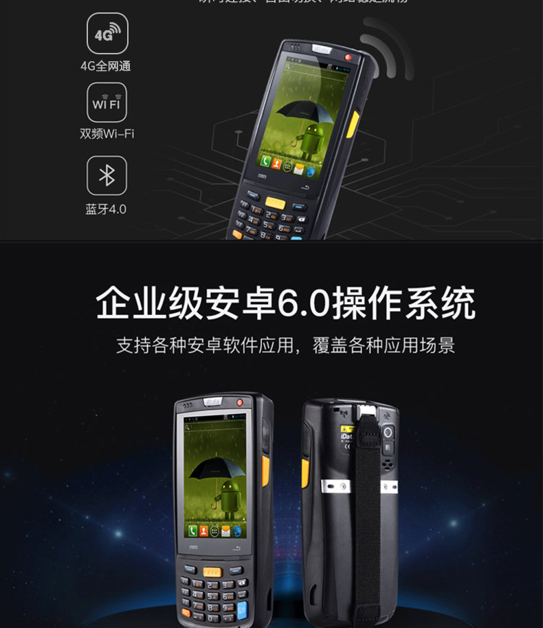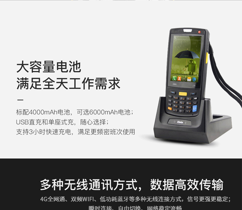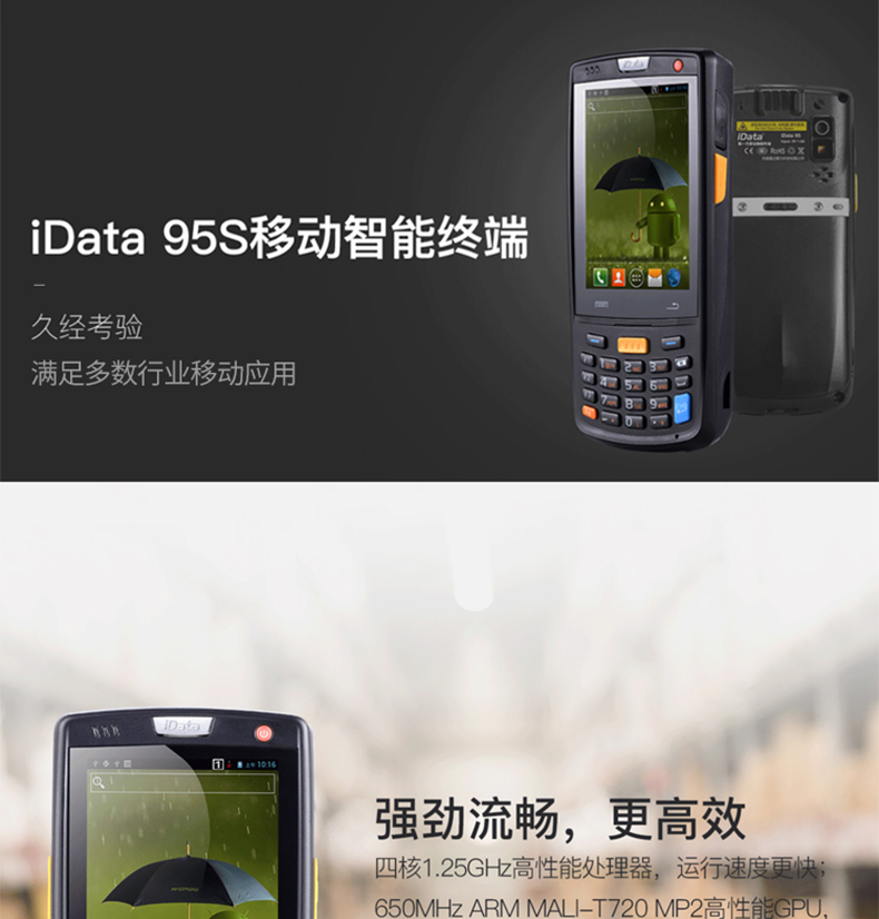 iData 95S移动智能终端,同类产品中性价比最高,大容量电池,支持4G全网通、双频WIFI、低功耗蓝牙等多种无线连接方式,可单手操作,握感舒适。机身坚固,不惧损伤,满足复杂、恶劣的工作环境。可运用于快递物流、零售超市、仓库盘点等场景。
