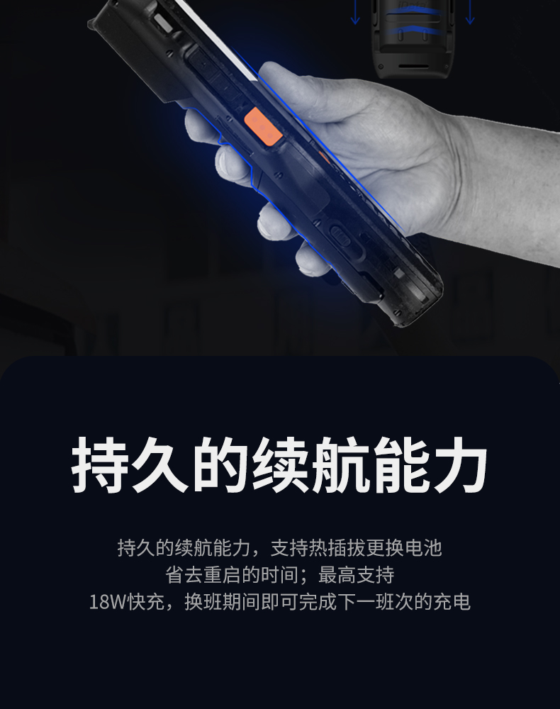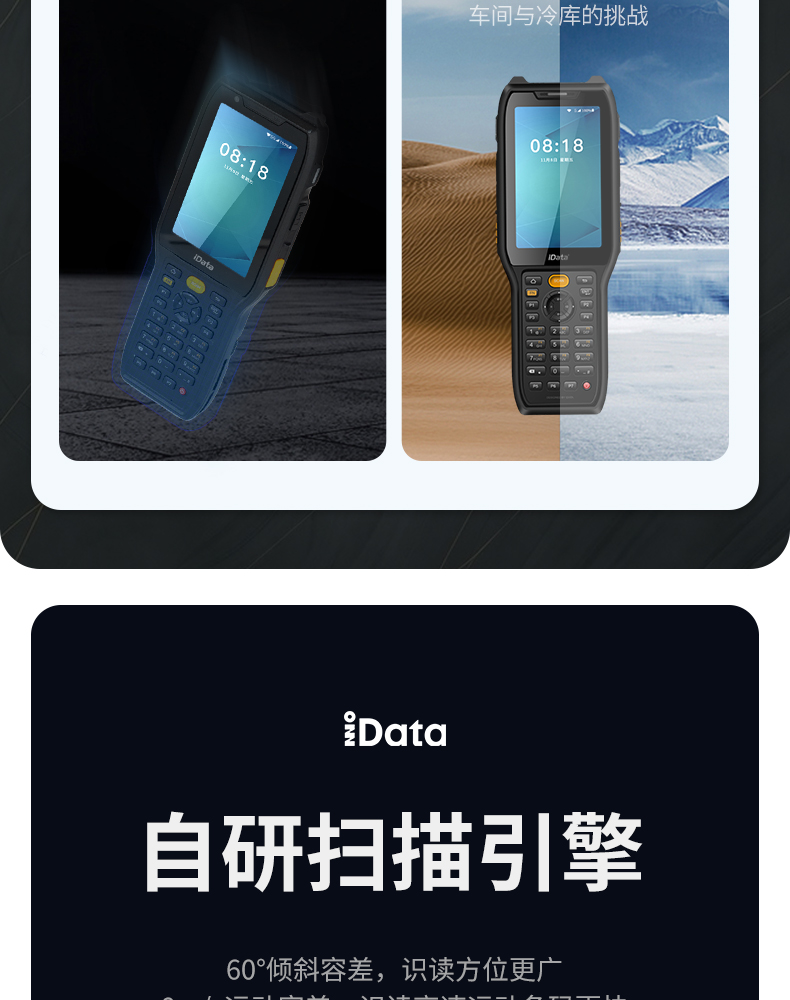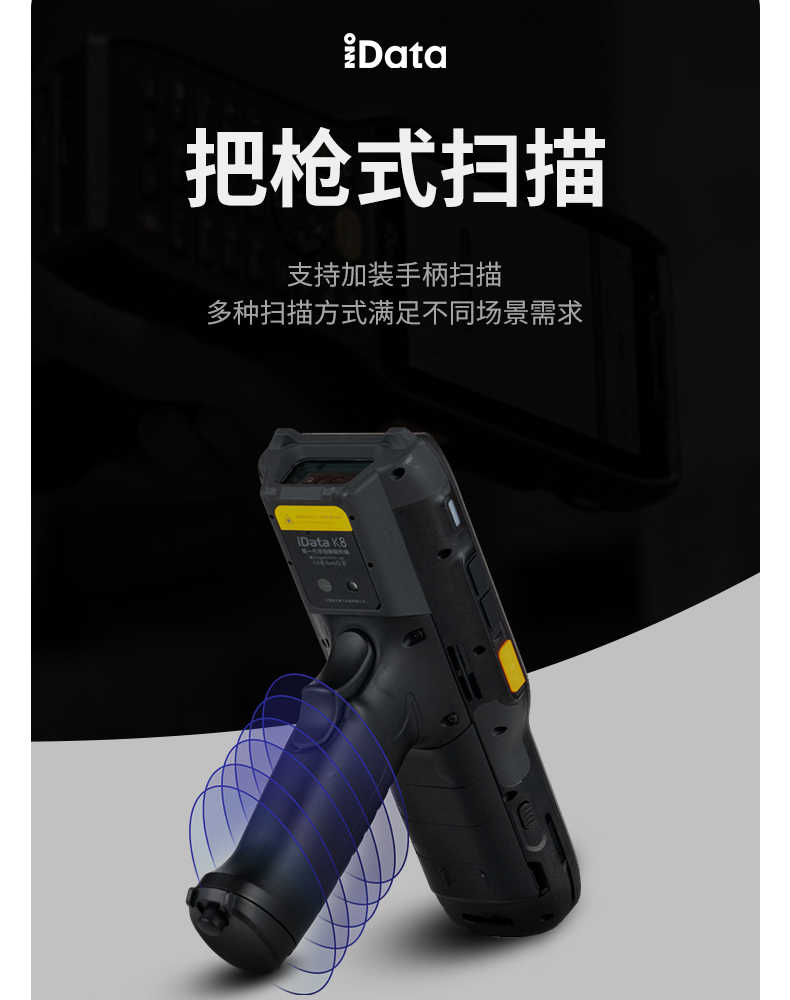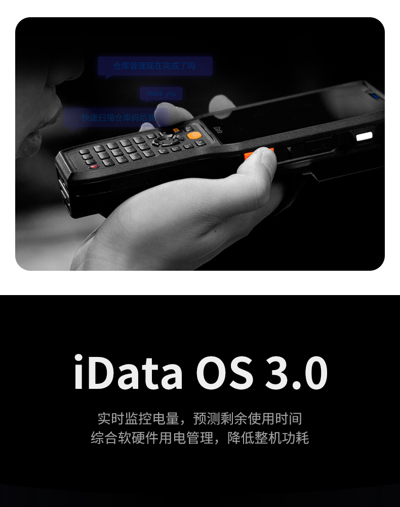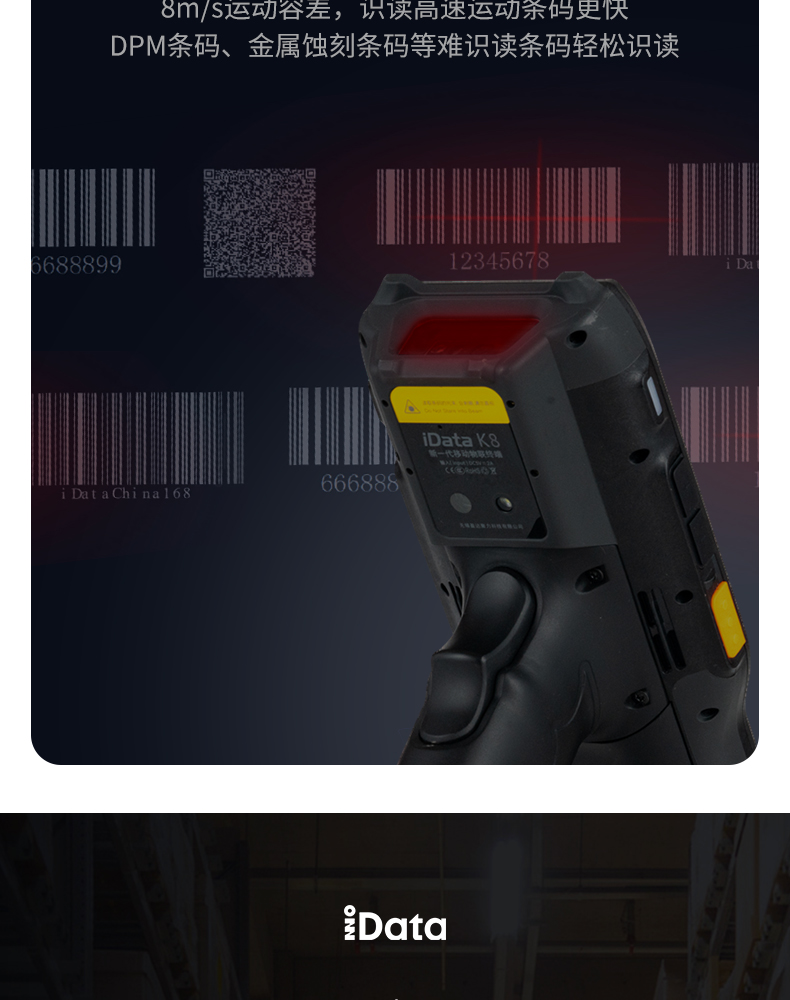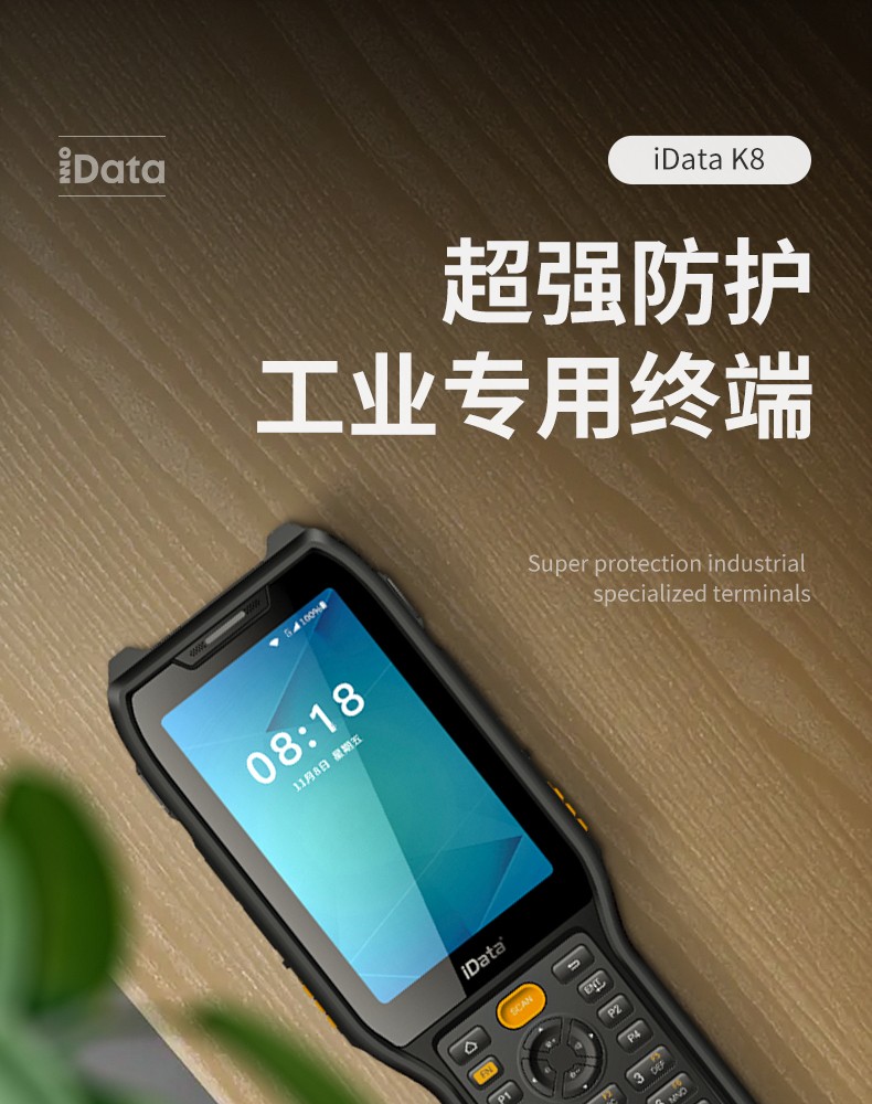 iData K8超强防护工业专用终端,防水、防尘、抗跌落、耐高低温。为复杂场景而生,60°倾斜容差、8m/s运动容差,提供极致舒适扫描体验。支持21.4米远扫描引擎,大型仓库、高度货架一扫即达。适用于仓储、物流等K8一触即发人生赢家。